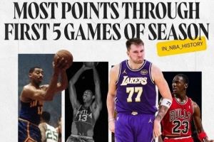 在赛季的前五场比赛中,东契奇合计得到200分,历史第三高,仅次于张伯伦的两次表演,详情如下:
